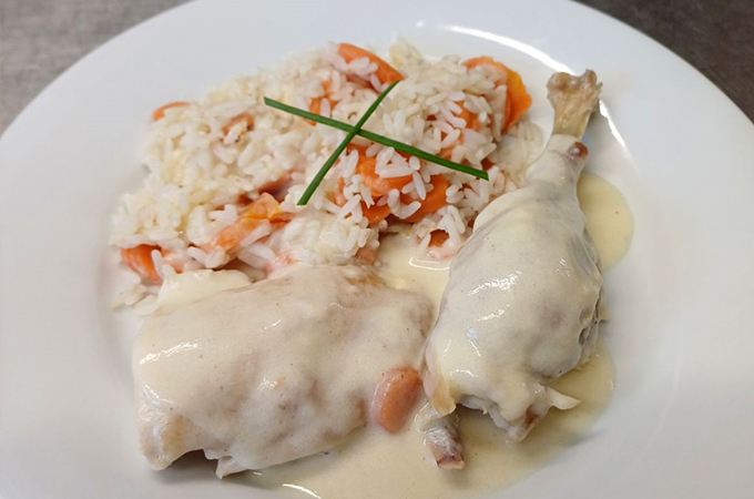 Pintade braisée– Frites ou pommes de terre texane ou haricots blancs à la tomate